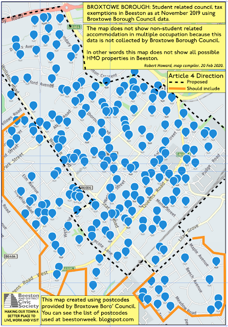 As another councillor pointed out, it is a pity that the focus is on students when there are a good many non-student HMOs in Beeston. As I have repeatedly said in this blog since February 2015, when I produced and posted my first maps and tables, the data for non-student households doesn't exist. The nearest you can get to tracking them is via the electoral roll. However many overseas nationals, despite having a vote in local elections, choose not to register now that voter registration is voluntary.